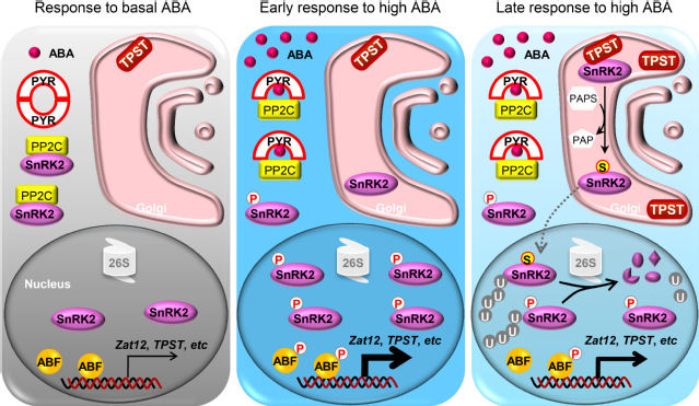 酪氨酸磺基转移酶(Tyrosylprotein sulfotransferase, TPST)催化底物蛋白的酪氨酸残基(Y)发生磺基化(-SO3H)修饰,进而调控底物蛋白的活性、稳定性及蛋白间的互作等特性。拟南芥基因组中仅存在一个TPST成员,该研究发现拟南芥tpst突变体对ABA超敏感,且该突变体中ABA信号转导通路被过度激活。进一步的研究表明,TPST与ABA信号转导通路中的关键激酶SnRK2.2/2.3/2.6互作并将其磺基化。发生磺基化修饰的SnRK2.2/2.3/2.6蛋白稳定性显著降低并通过26S蛋白酶体途径被快速降解,从而降低ABA信号转导强度,避免ABA信号被长期过度激活。此外,TPST基因也被ABA诱导表达。本研究揭示了一条通过磺基化修饰实现ABA信号转导“刹车/脱敏”的新机制。